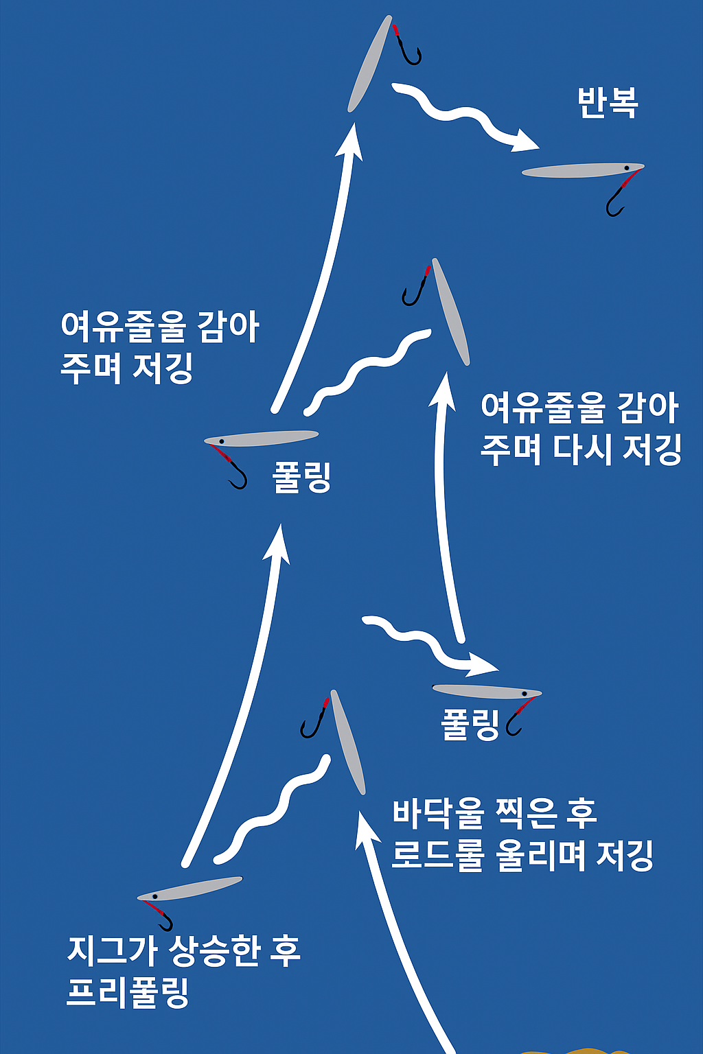 제가 처음 배운 건 ‘원피치 원저크’였습니다. 단순해 보여도 막상 물속에서 정확히 리듬을 유지하려면 꽤 어렵더라고요. 특히 바닥 찍고 올라오는 타이밍을 놓치면 입질 찬스를 날릴 수 있어요. 큰 고기가 걸렸을 땐 릴을 억지로 감기보다, 드랙 설정을 통해 천천히 상체로 끌어올리는 게 정석입니다.